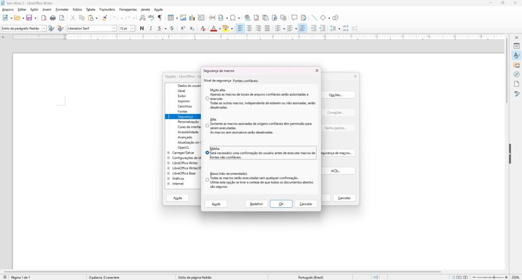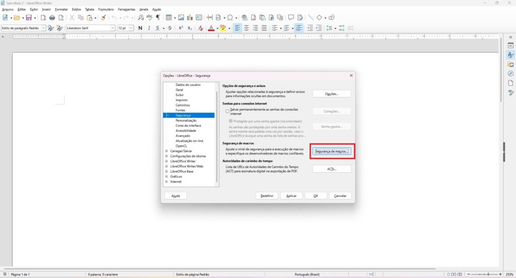 Para utilizar corretamente o LibreOffice no e-DOC Sergipe são necessárias as seguintes configurações de segurança: