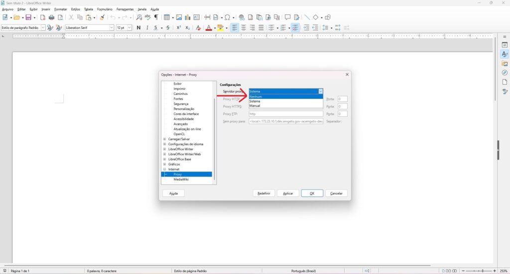 Passo 4: No menu do LibreOffice acesse Ferramentas / Internet / Proxy e no campo Servidor Proxy selecione a opção Nenhum, confirmando em OK