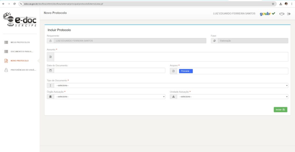 Clique em Novo protocolo no menu à esquerda da tela e o sistema apresentará a tela de Incluir Protocolo abaixo